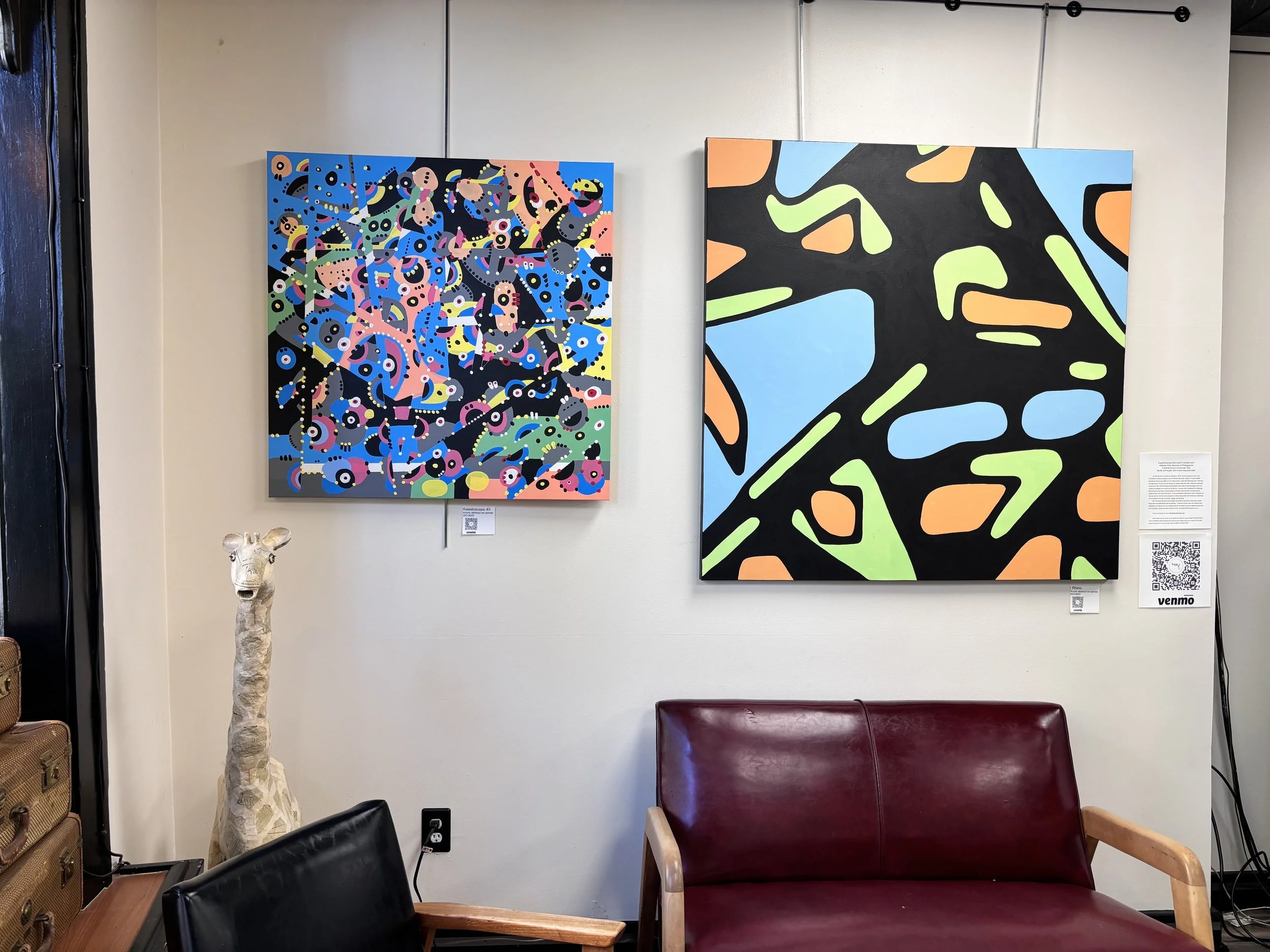 Around the time I moved to Asheville in 2020, I found a space to rent in the Foundations Studios building in the Art District. My studio neighbor, Onicas Gaddis, showed me how to put plastic on my walls so that I could start throwing paint. That was the beginning of my journey into finding my unique style and when I realized making art could be fun! My nearly 80 piece stained-glass style body of work all began when my mother encouraged me to paint on my first 3 x 4 canvas, and I accepted the challenge. My technique uses tape to create shapes to fill with color and then rounding all the edges by hand with solid black paint. I have continued to experiment, often changing my style as I aim to find the most enjoyment in the process while still achieving a satisfying and fun balance through my colors, shapes, and layering.